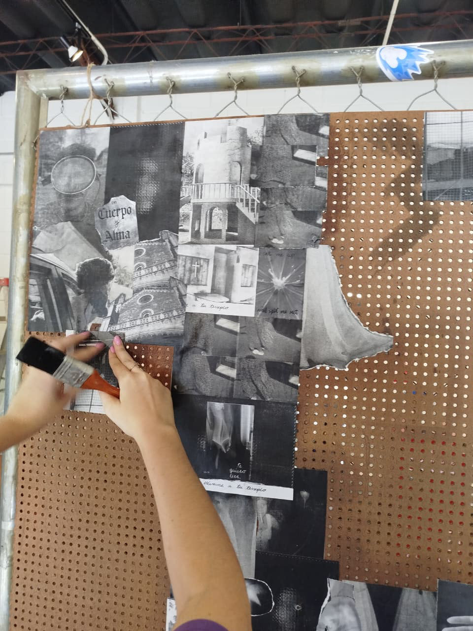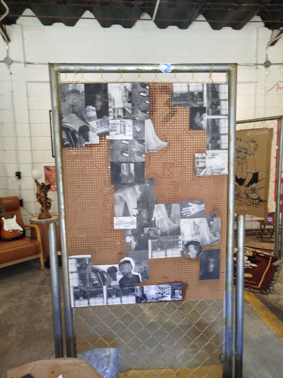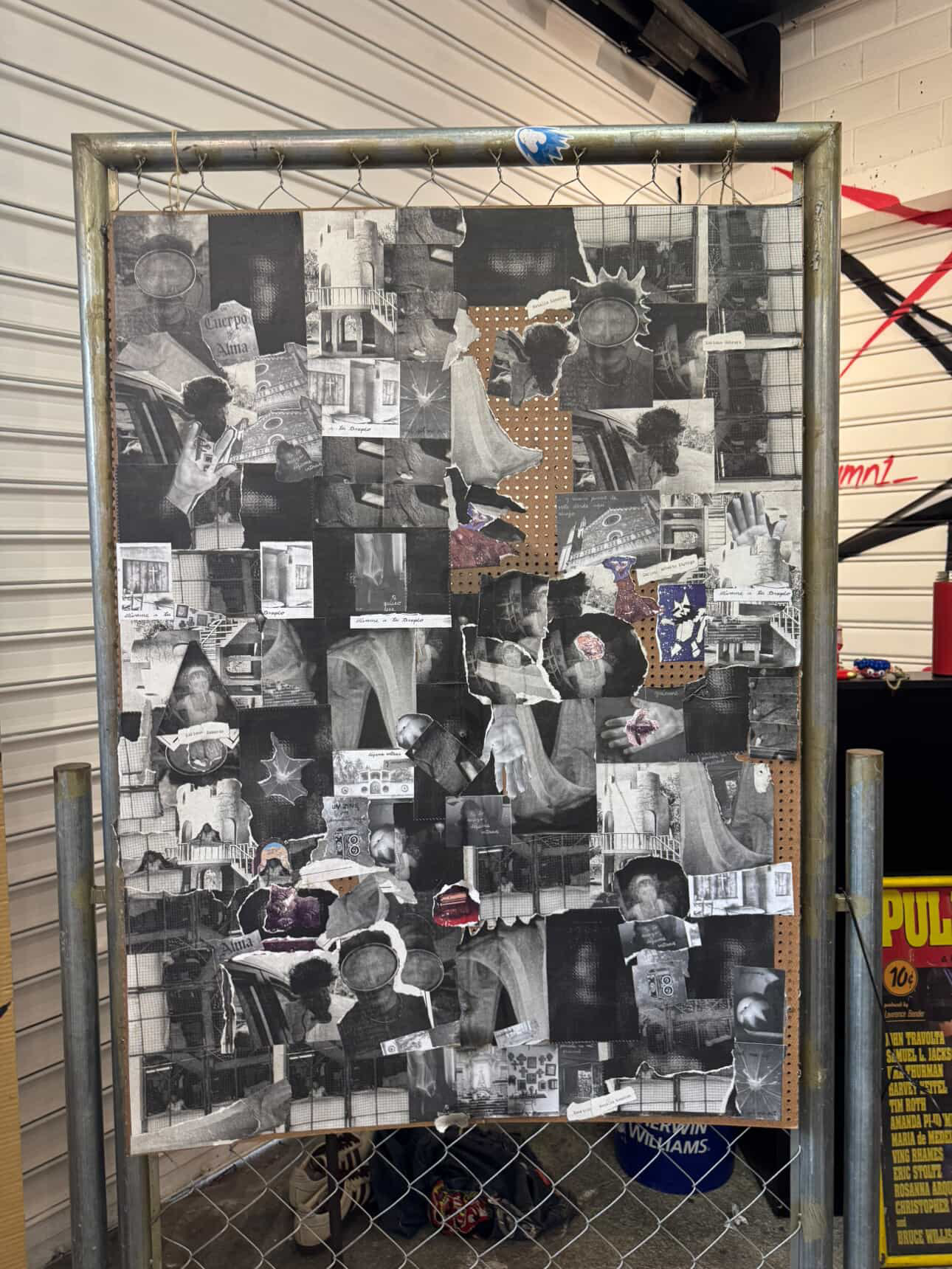 La re apertura de la tienda “ropa chuca” nos dio la oportunidad de tener un mural colaborativo, usando pegamento una tabla montada en un stand de hierro y postales y fotos de camarita vieja.